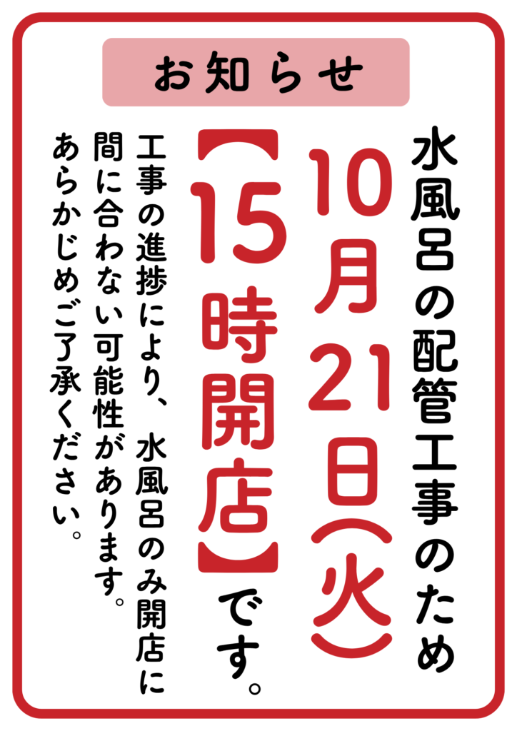 水風呂の配管工事のため、以下の日程の開店時間が変わります。