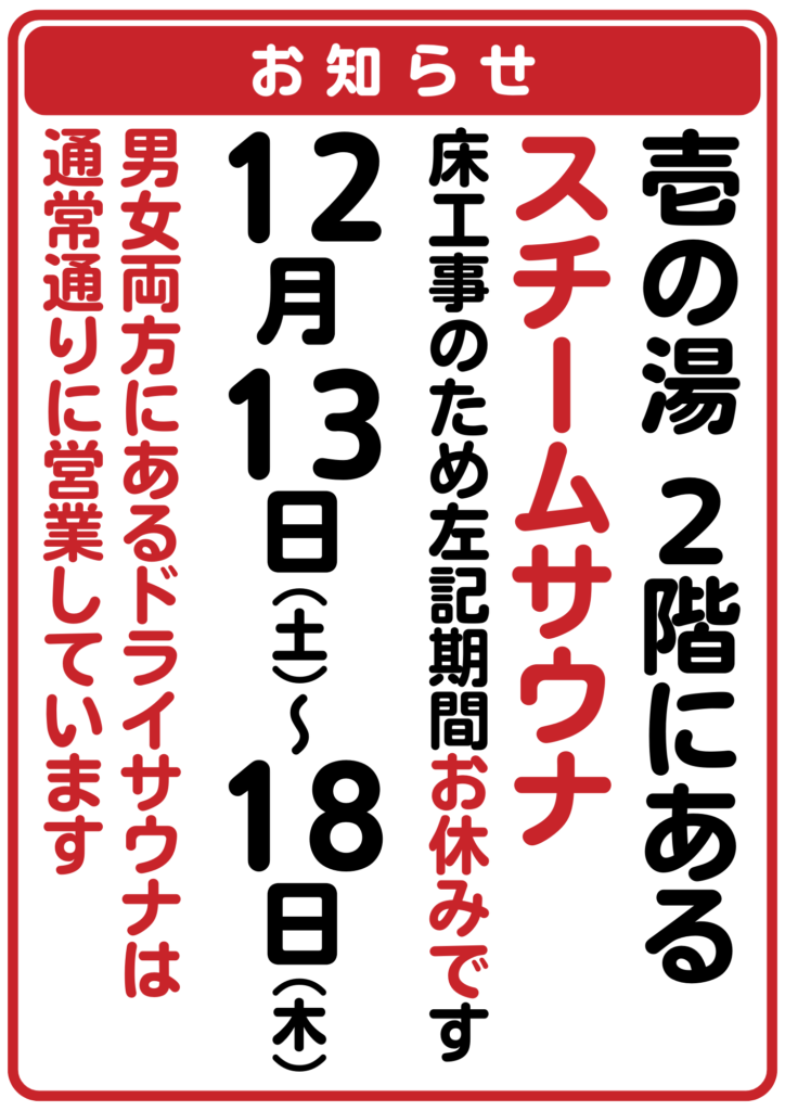 階段の床の工事を行うため、以下の期間は壱の湯2階にあるスチームサウナは休止となります。